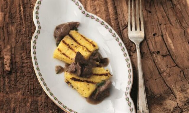Serveer 2 stukken polenta per persoon met warme levertjes.