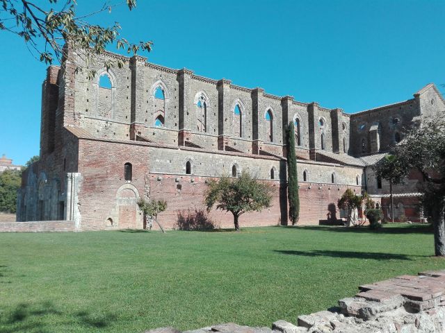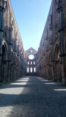 Hoewel de grote abdij nu ontwijd en in puin is, spreekt de plek in het mooie Toscane nog sterk tot de verbeelding. Je ziet een spectaculair monument met de lucht in plaats van een dak. Onmogelijk niet te denken aan de monniken die hier in de 13de eeuw leefden in de schaduw van de hermitage van Galgano.