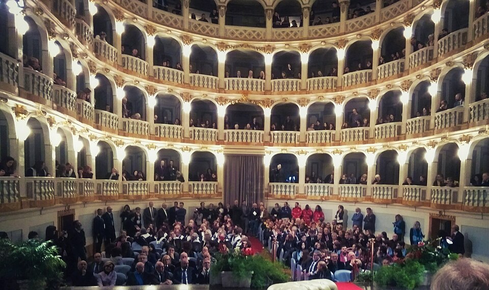 Macerata is een van de oudste universiteitssteden van Italië. In 1290 kreeg het al een Studium Legum. Ook nu huist er nog een universiteit, meteen al een eerste bezoekje waard. De grote aula van de Rechtsfaculteit brengt je een paar eeuwen terug in de tijd. Je belt gewoon even aan aan de grote poort van de Università. Een bereidwillige bediende loopt met een grote huissleutel even voor. Lichten worden ontstoken zodat je rustig kan rondkijken en fotograferen, ook als je alleen of met z’n tweetjes bent.