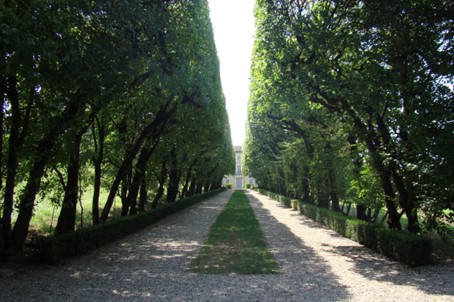 Hier vinden we het spectaculaire ’teatro di verzara’ aan het einde van een lange laan met haagbeuken.