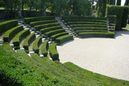 De tuin imiteert het theater. Terwijl het toneel meestal uit een verhoogd grasveld bestond, werden voor de coulissen vaak buxus- of taxushagen gebruikt en het toneel was vaak versierd met beelden, misschien zinspelend op de thema’s komedie en tragedie of commedia dell’arte.