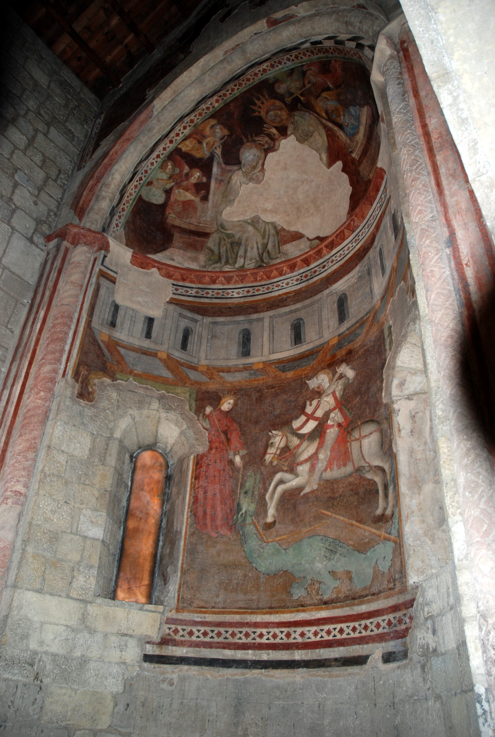 Vigoleno heeft maar één centraal straatje en dat brengt je naar het 12e-eeuwse romaanse kerkje van San Giorgio, dat er zowel binnen als buiten nog net zo uitziet als toen het gebouwd werd. Binnen vind je resten van oude fresco’s. De paar huizen die Vigoleno telt lijken de beschutting van de kerk en daarmee de bescherming van Sint-Joris te zoeken.